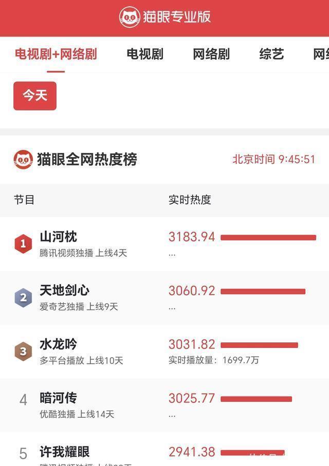 截止11月2日上午9时45分,从“猫眼专业版”实时数据显示可知当前热播电视剧中,网播热度排行榜前五分别如下: 1、《山河枕》 主演:宋茜/丁禹兮/付辛博 剧情点评:有些剧情实在是太弱智,比如女主在大街桥上舞剑,前夫哥结婚经过大可一走了之,结果说是女主导致街道拥堵,这是在干什么,明明路上行人都让开了……还有第三集的战役,他们都被围困在山谷里了,结果大哥和小七在那道别,虽然我确实被搞哭了,但看到第八集最终还是选择弃剧,女主说自己喜欢舞刀弄枪,可是看了这么久,我实在看不出来她是如此之人。女主和男主撒糖也过于工业糖精,取铃铛簪这种事情是合理的吗?我是对宋茜和丁禹兮蛮有好感的,宋茜很美,丁禹兮很帅演技也有惊喜,但是抱歉,古偶实在是让我太失望了。
